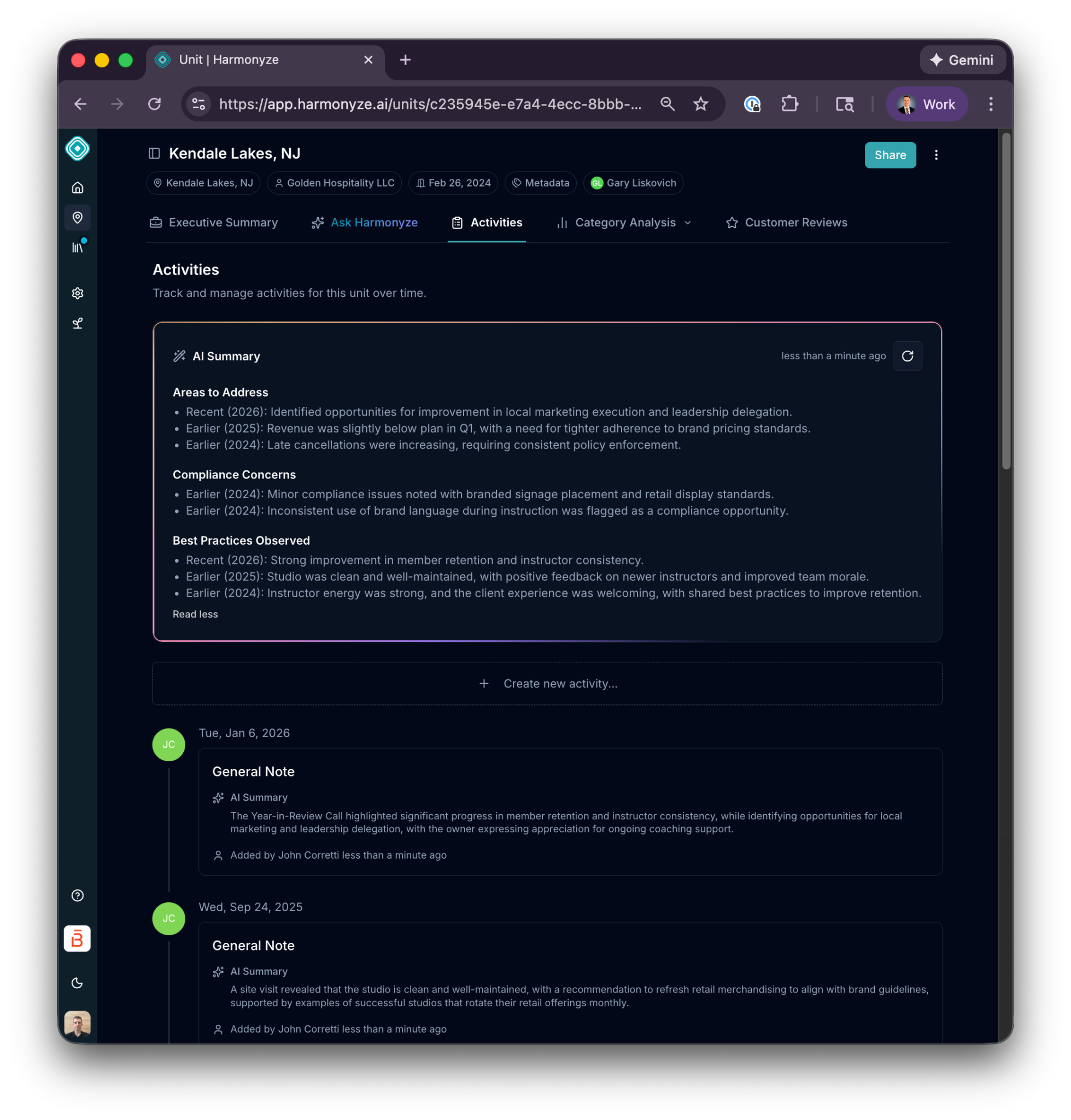 That is the role of the Activities feature in Harmonyze. It captures the human side of performance: site visits, coaching calls, operational observations, compliance notes, training discussions, and follow ups that shape how a franchisee is actually operating. Activities answer practical coaching questions: