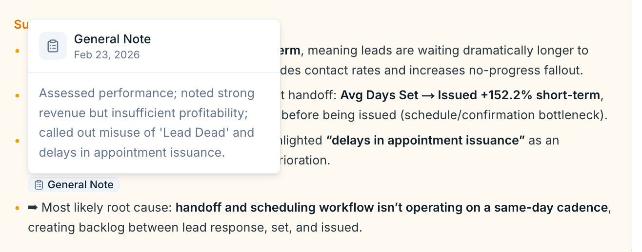 Harmonyze synthesizes activity notes to surface best practices, highlight areas of concern, and identify compliance gaps. That context feeds directly into the broader performance view.