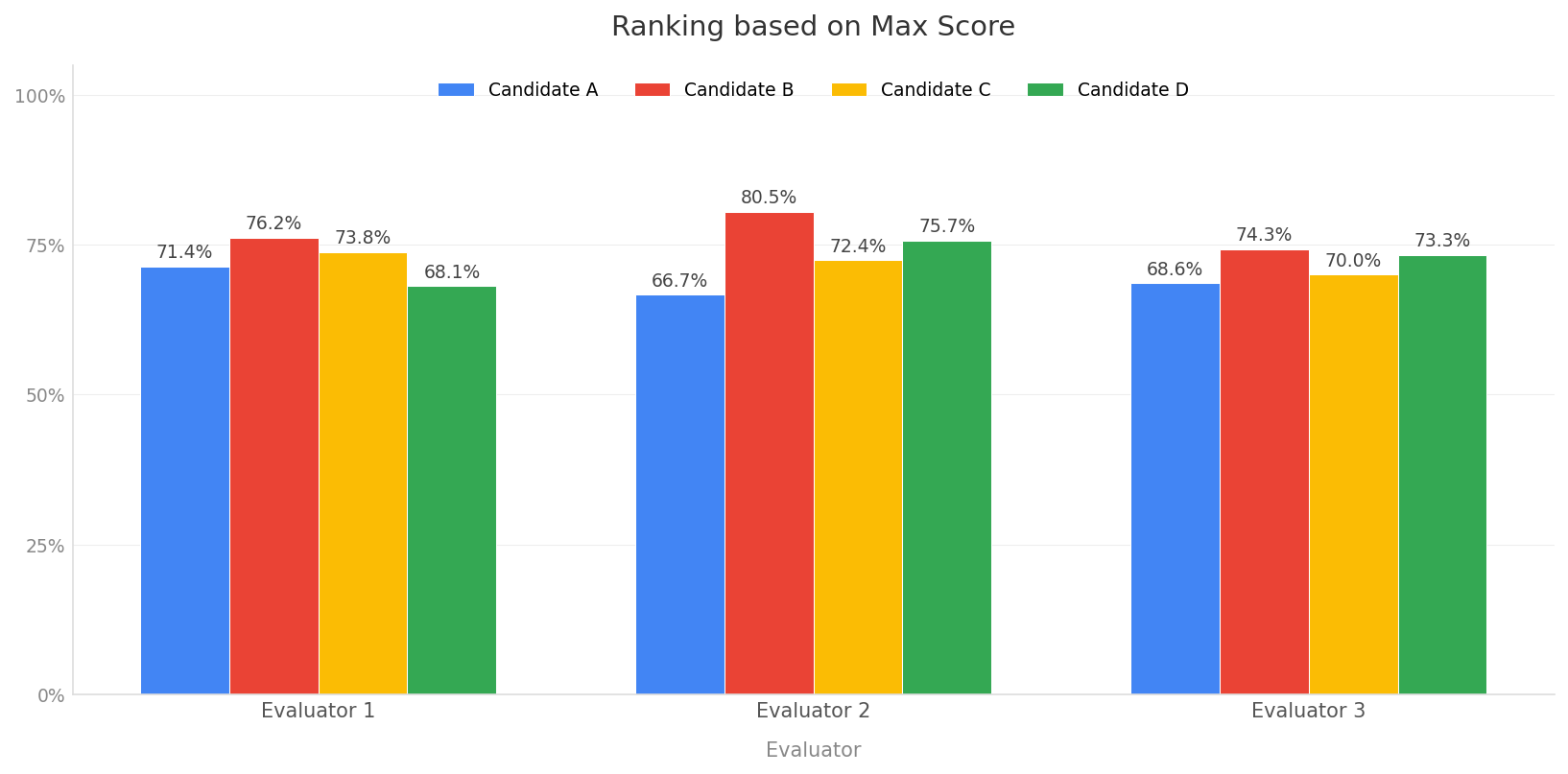 You'll see that everyone on the team had slightly different opinions. One evaluator had a different person in first place than the others. Someone scored a candidate significantly higher than everyone else did. The charts tell a decent story, but there's no obvious winner.